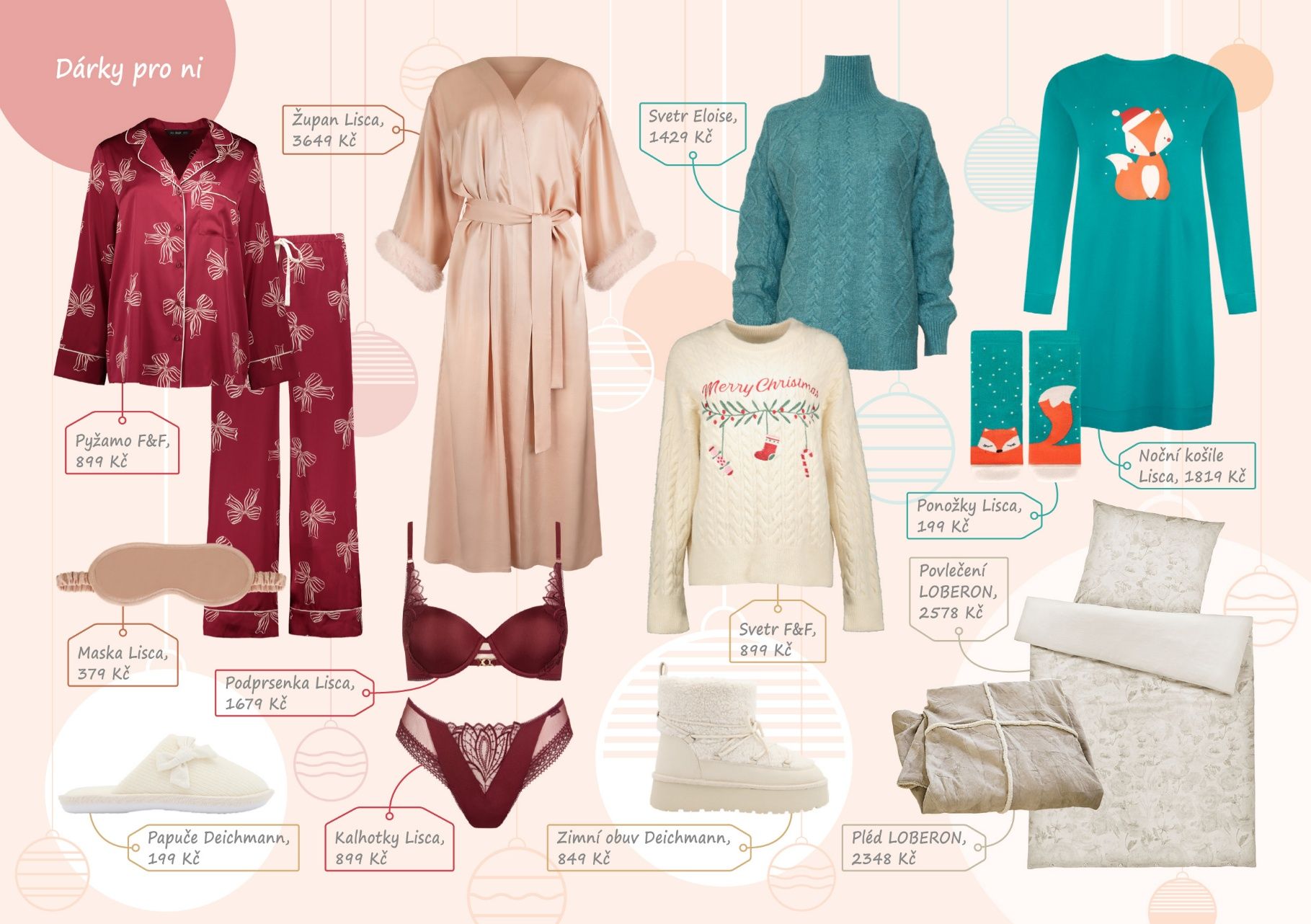 Přemýšlíte, čím potěšit sestru, maminku, babičku nebo kamarádku? Většina žen ocení dárky, které propojují komfort se stylem. Dopřejte jim něco pro domácí rituál, například příjemné pyžamo, hravou noční košili, měkoučký župan, ponožky, masku na spaní či domácí bačkory. Krok vedle neuděláte ani pleteninami – rolákem, svetrem s vánočními motivy či hřejivými zimními doplňky. Pokud dobře znáte vkus či velikost obdarované, nemusíte se bát ani dárků v podobě nadčasové kabelky nebo teploučkých zimních bot. Letos vedou také vkusné doplňky do bytu: udělejte radost měkkým povlečením, plédem nebo jinou dekorací do interiéru. Plánujete udělat radost sama sobě? Vsaďte třeba na luxusní spodní prádlo, které si běžně nedopřejete.