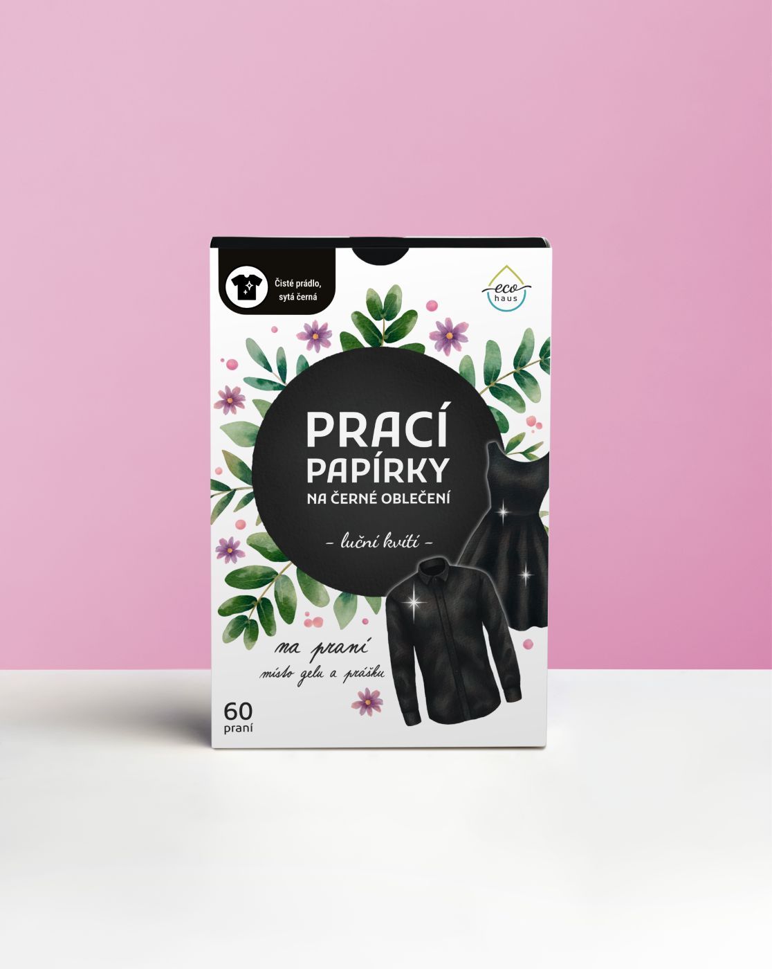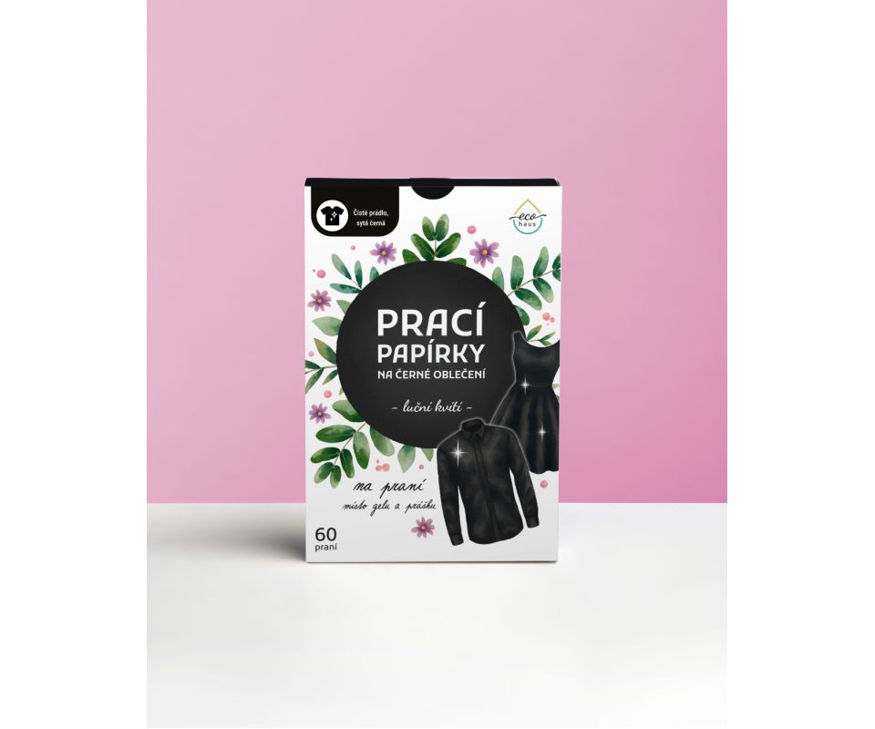 - Prací papírky EcoHaus na černé prádlo – vůně luční kvítí (60 praní a 5 praní)