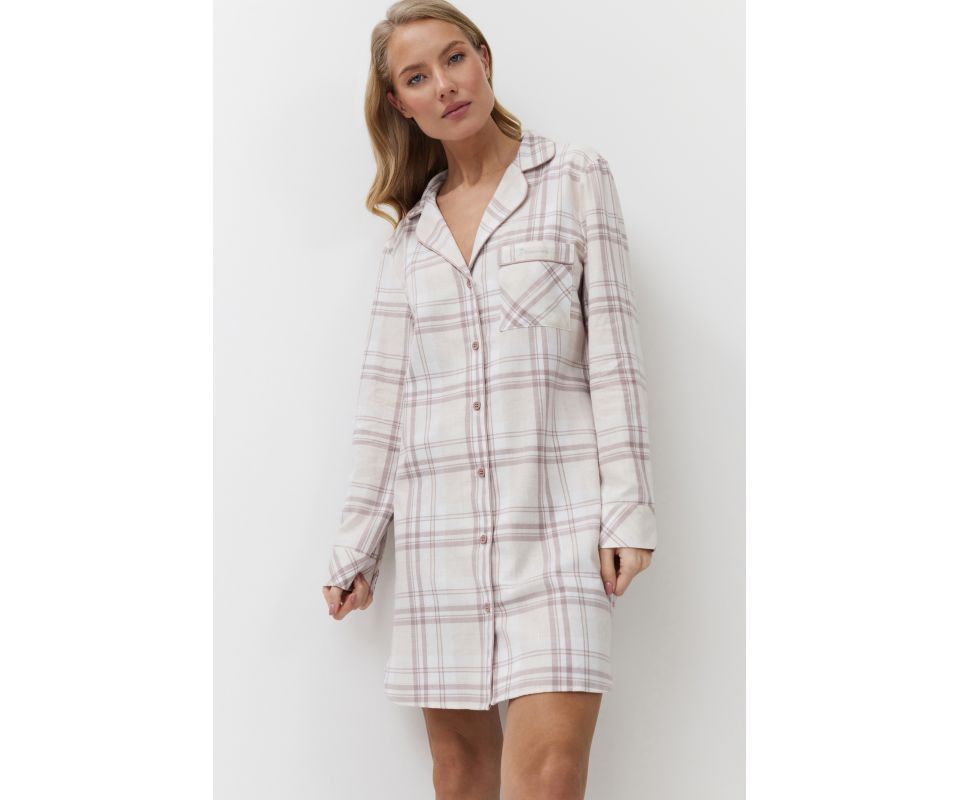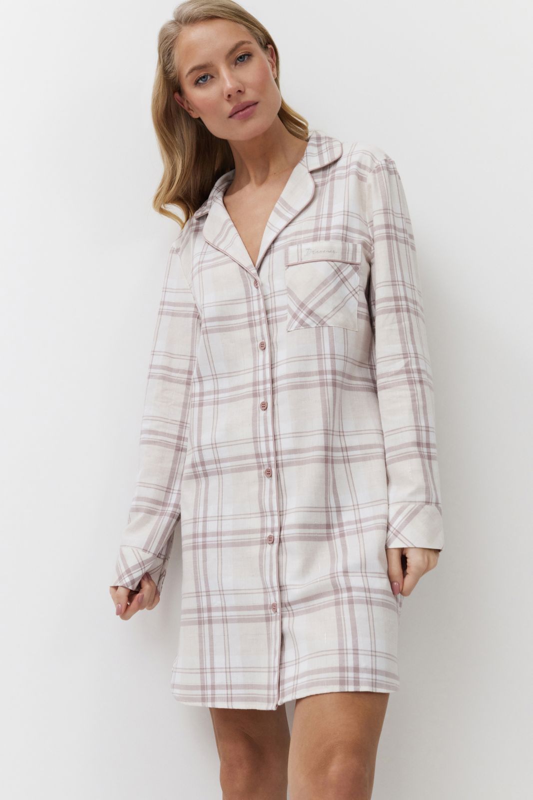 Jemná noční košile z 100% bavlny nabízí maximální pohodlí díky volnému střihu, dlouhým rukávům a knoflíčkové légie. Elegantní bílý a béžový kostkovaný vzor doplňuje decentní lemování na manžetách a náprsní kapse.