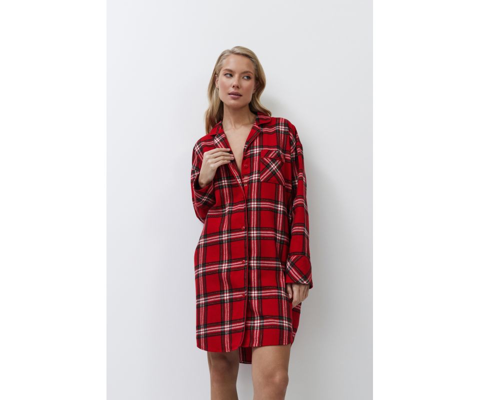 Hřejivá červená košile z bavlněného flanelu s kostkovaným vzorem a hravou výšivkou Weekend mode přináší dokonalý komfort pro chladné večery. Volný střih s délkou nad kolena je ideální pro domácí pohodu. Dostupná i v pánské variantě.