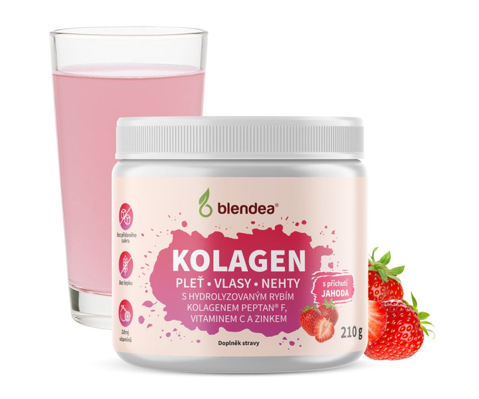 Dopřejte pleti, vlasům i nehtům péči, kterou si zaslouží. Blendea Kolagen s jemnou jahodovou příchutí obsahuje hydrolyzovaný rybí kolagen Peptan® F, vitamin C, zinek a kyselinu hyaluronovou – kombinaci, která podporuje přirozenou tvorbu kolagenu a pomáhá udržet mladistvý vzhled.