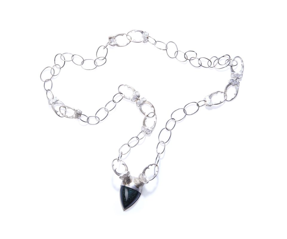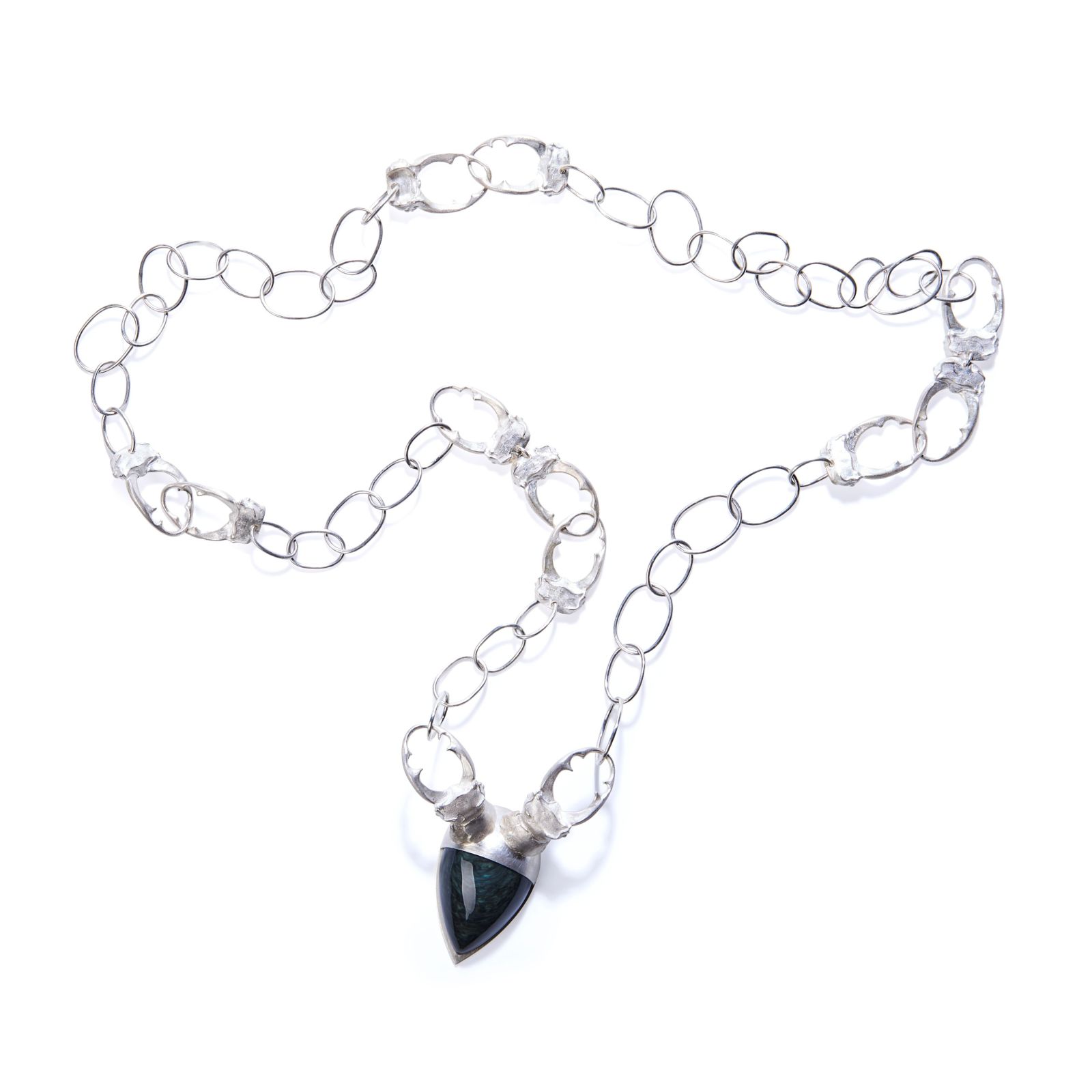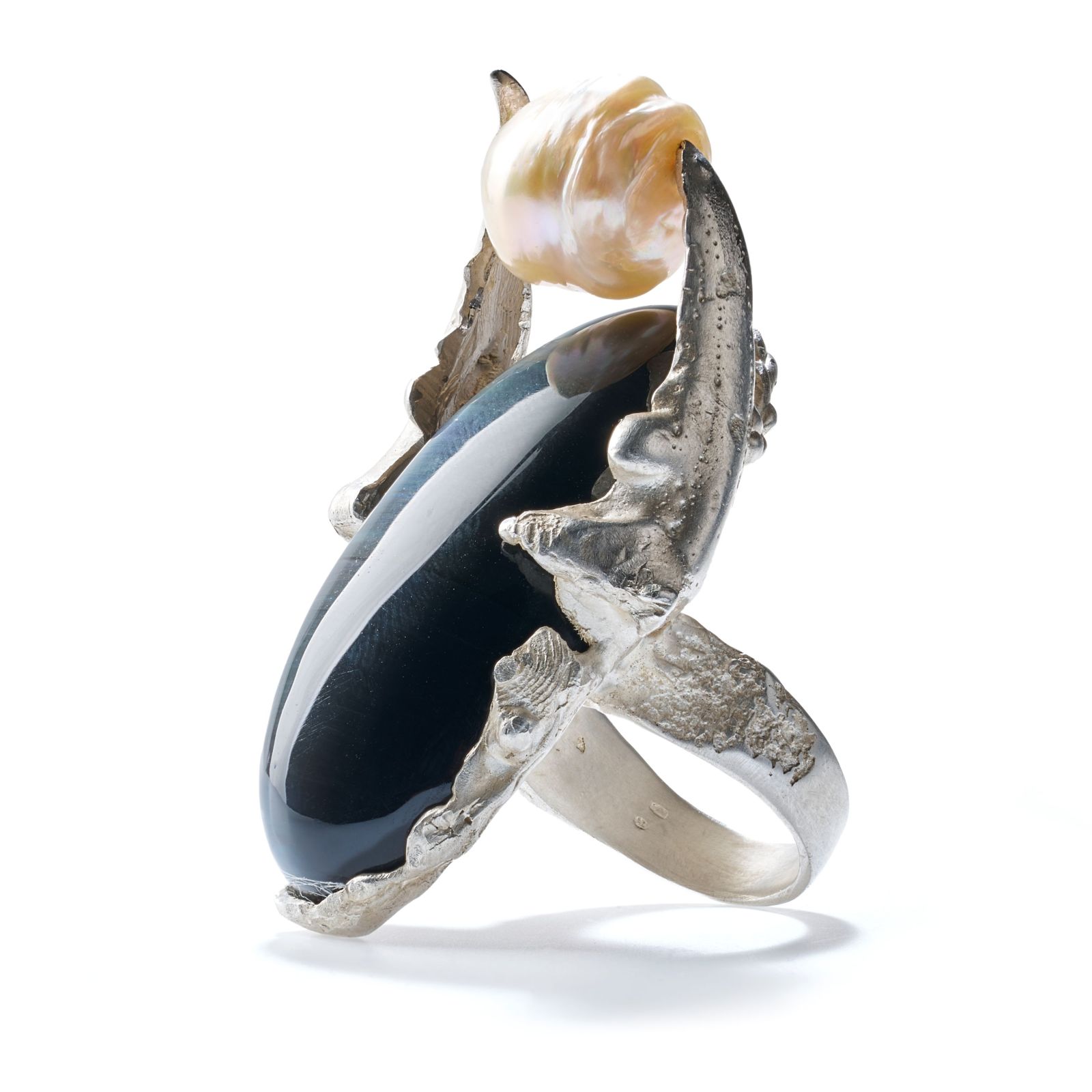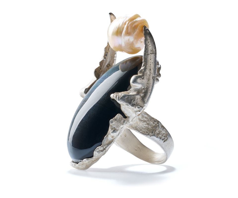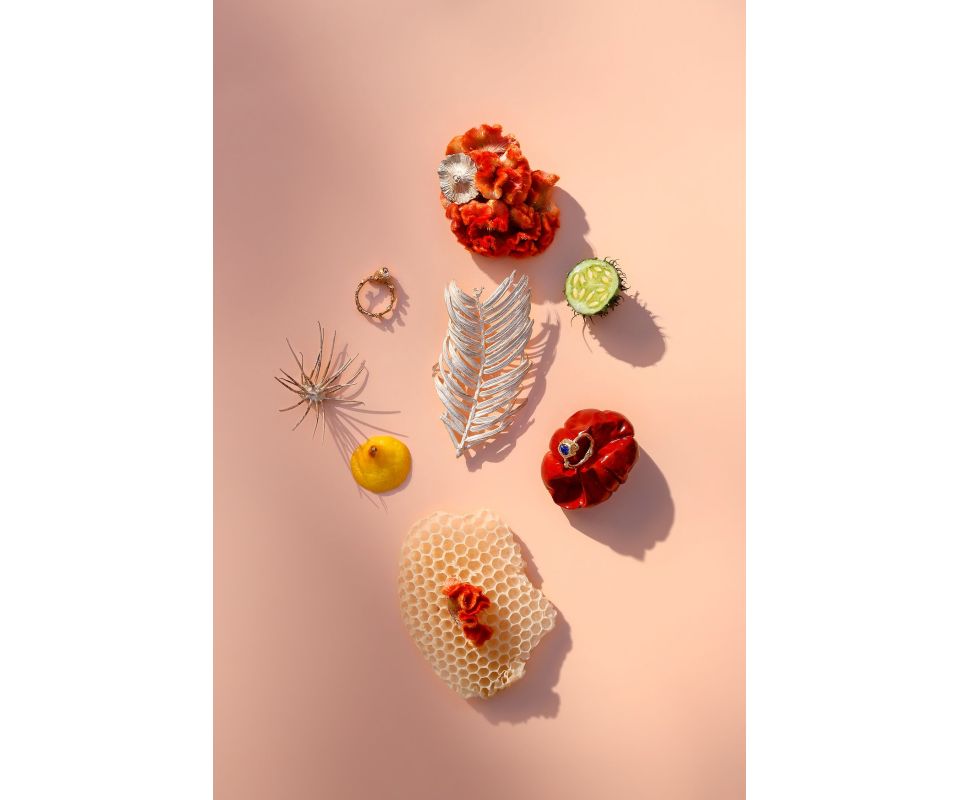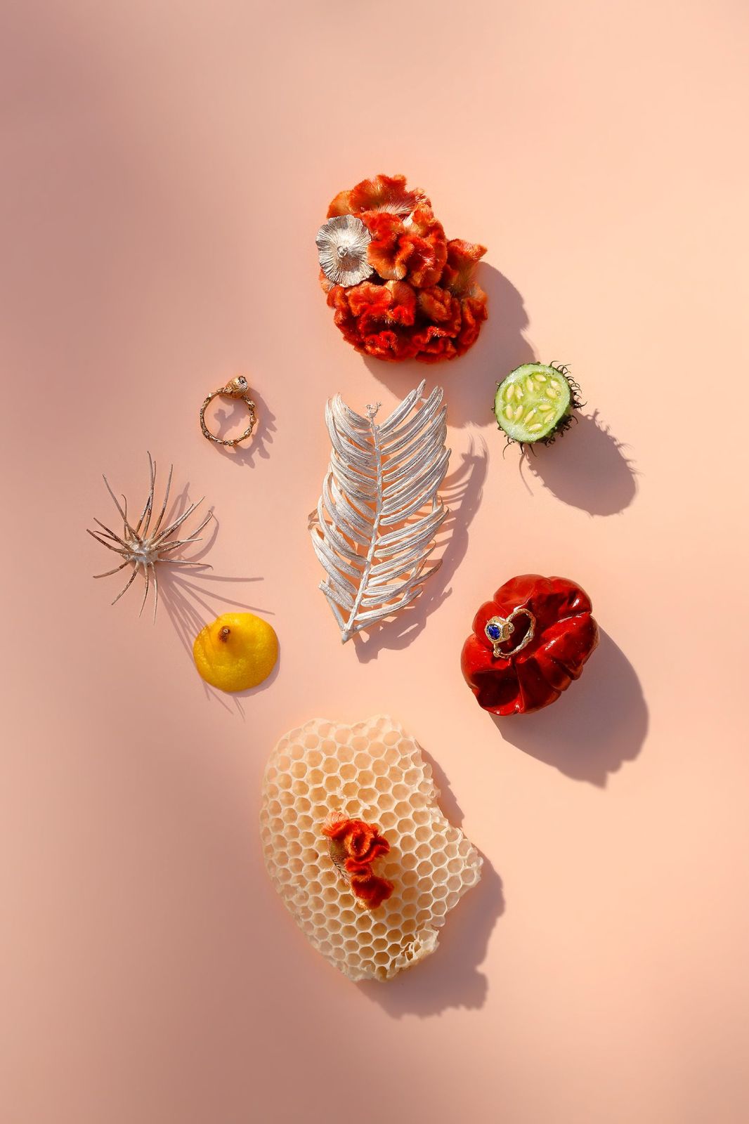 Přímé odlévání zachovává autentickou strukturu přírodnin, která kontrastuje s hladkým povrchem drahých kamenů a vytváří napětí mezi organickým a ušlechtilým.