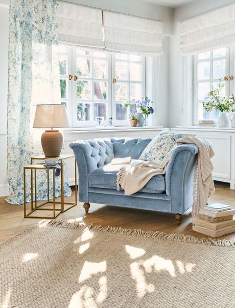 Modrá pohovka z lesklého sametu, LOBERON, 29 998 Kč, lněné povlaky na polštářky s květinovým potiskem LOBERON, 998 Kč, odkládací stolek s kulatou deskou, LOBERON, 2 578 Kč, konzolový stolek z masivního dřeva, LOBERON, 15 498 Kč, lampa, LOBERON, 3 898 Kč, 498 Kč, proutěný koš, LOBERON, 998 Kč
