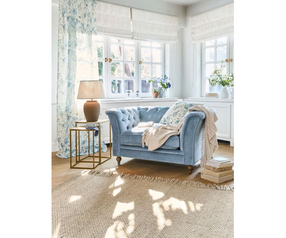 Sametová čalouněná pohovka v chesterfieldském stylu, LOBERON, 25 998 Kč, lněný povlak na polštářek s motivem motýlů, LOBERON, 648 Kč, lněný závěs s motivem motýlů, LOBERON, 2 198 Kč, stolní lampa, LOBERON, 2 578 Kč, robustní koberec, LOBERON, 4 398 Kč.