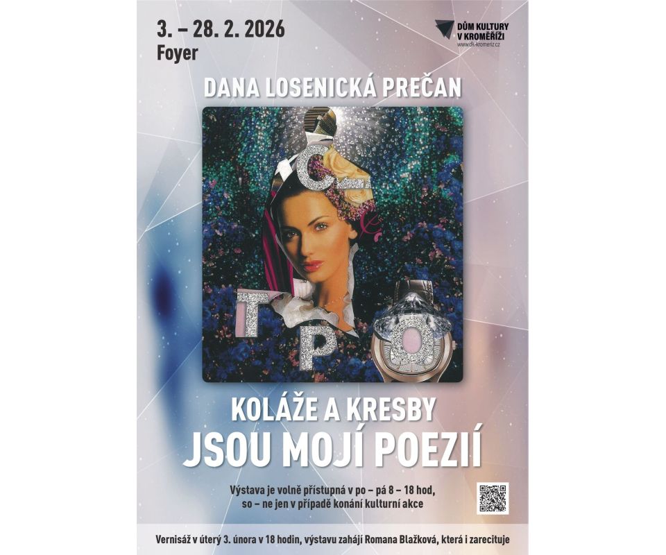Originální koláže a kresby představí v rozsáhlém foyer Domu kultury v Kroměříži během února olomoucká výtvarnice Dana Losenická Prečan. Na vernisáži, která proběhne v úterý 3. února v 18 hodin, zazní i několik ukázek z autorčiny básnické tvorby.