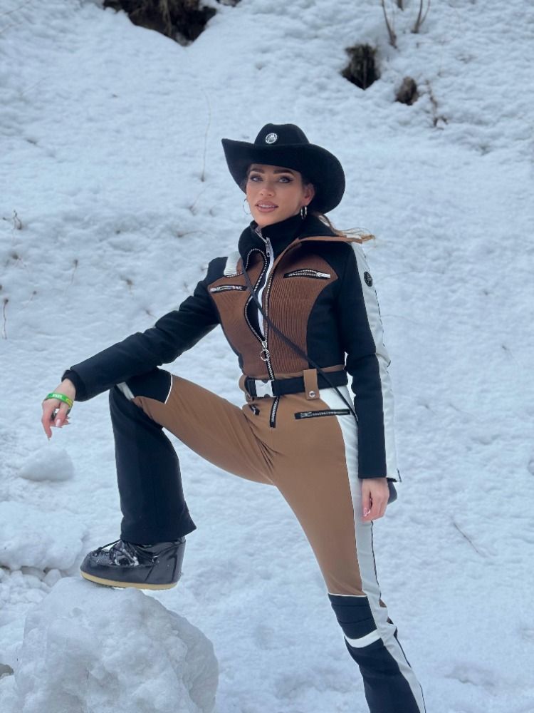 Černý klobouk, výrazné náušnice a přiléhavý overal byla kombinace, která okamžitě poutala pozornost. Verešová tentokrát zvolila zimní overal Fusalp z butiku SUMMIT-SPORT v hodnotě přes 37 tisíc korun. Look doplnila kovbojským kloboukem za dalších 7 tisíc, čímž vytvořila outfit, který by bez zaváhání obstál i v těch nejexkluzivnějších alpských letoviscích.