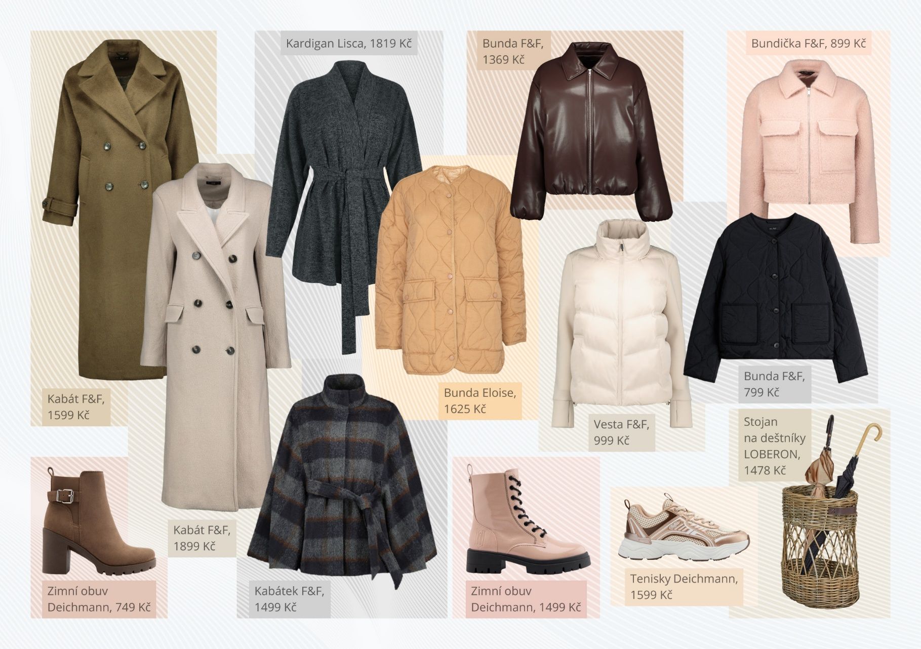 Letos dominuje jednoduchost s výrazem. Kabáty s velkými knoflíky, županové střihy se širokým páskem nebo oversize modely inspirované vojenským stylem. Pro milovníky vzorů jsou tu klasické kostky a kohoutí stopa, které nikdy neztrácejí šmrnc.