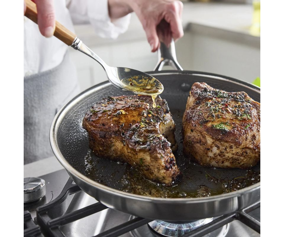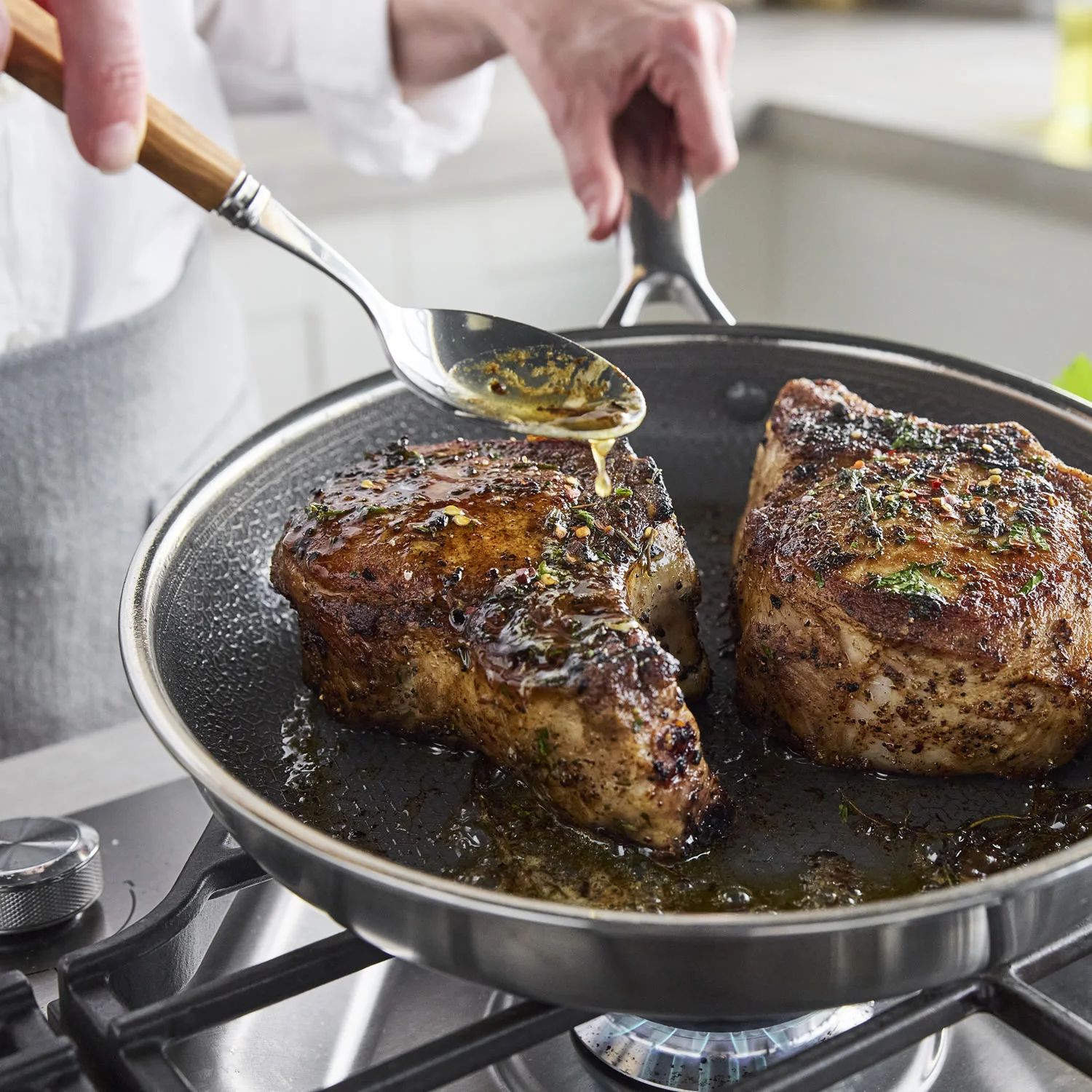 Přilnavé varianty zase zahrnují nerez, litinu, uhlíkovou ocel a měď. Právě tyto materiály ocení každý, kdo očekává práci při vyšších teplotách, výrazné opečení a poctivý výpek. Jsou mimořádně odolné, snesou i kovové náčiní a při správném používání vydrží v kuchyni i roky. Nerezová ocel je skvělou volbou zejména pro dynamickou práci s teplotou. Typickým příkladem jsou modely Zwilling PRO s technologií SIGMA Clad nebo Mauviel 1830 M’Cook, s uplatněním i v profesionální kuchyni.