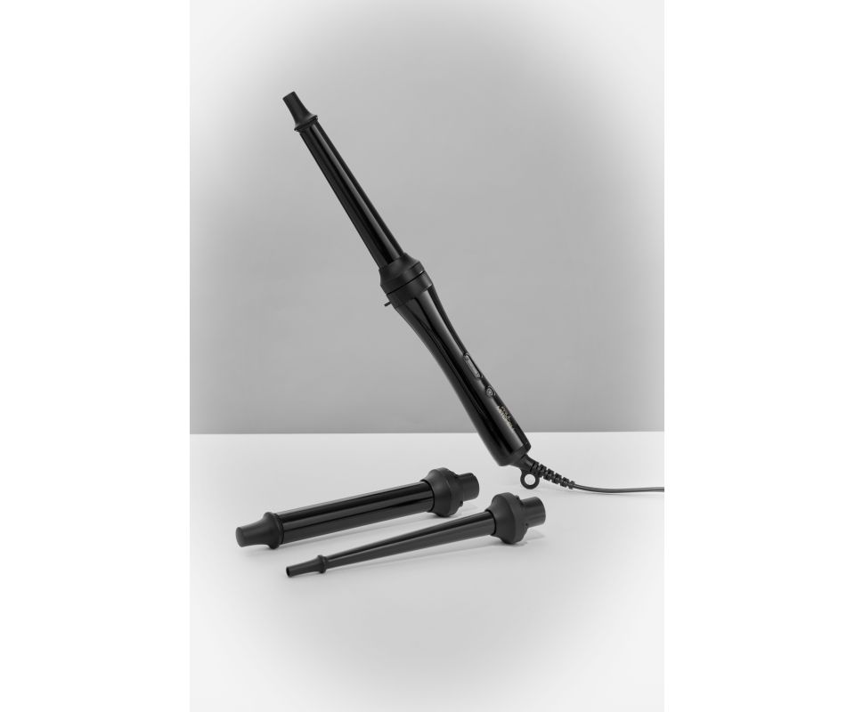 Balení obsahuje: ● Kuželový nástavec 0,75"–0,35" pro pevné spirálovité kudrny ● Rovný nástavec 1" pro klasické, definované lokny ● Kuželový nástavec 1"–0,75" pro přirozené beach waves ● Napájecí základnu s Push‑Release stojánkem ● Tepelně odolnou rukavici ● Ochranný obal pro cestování i skladování